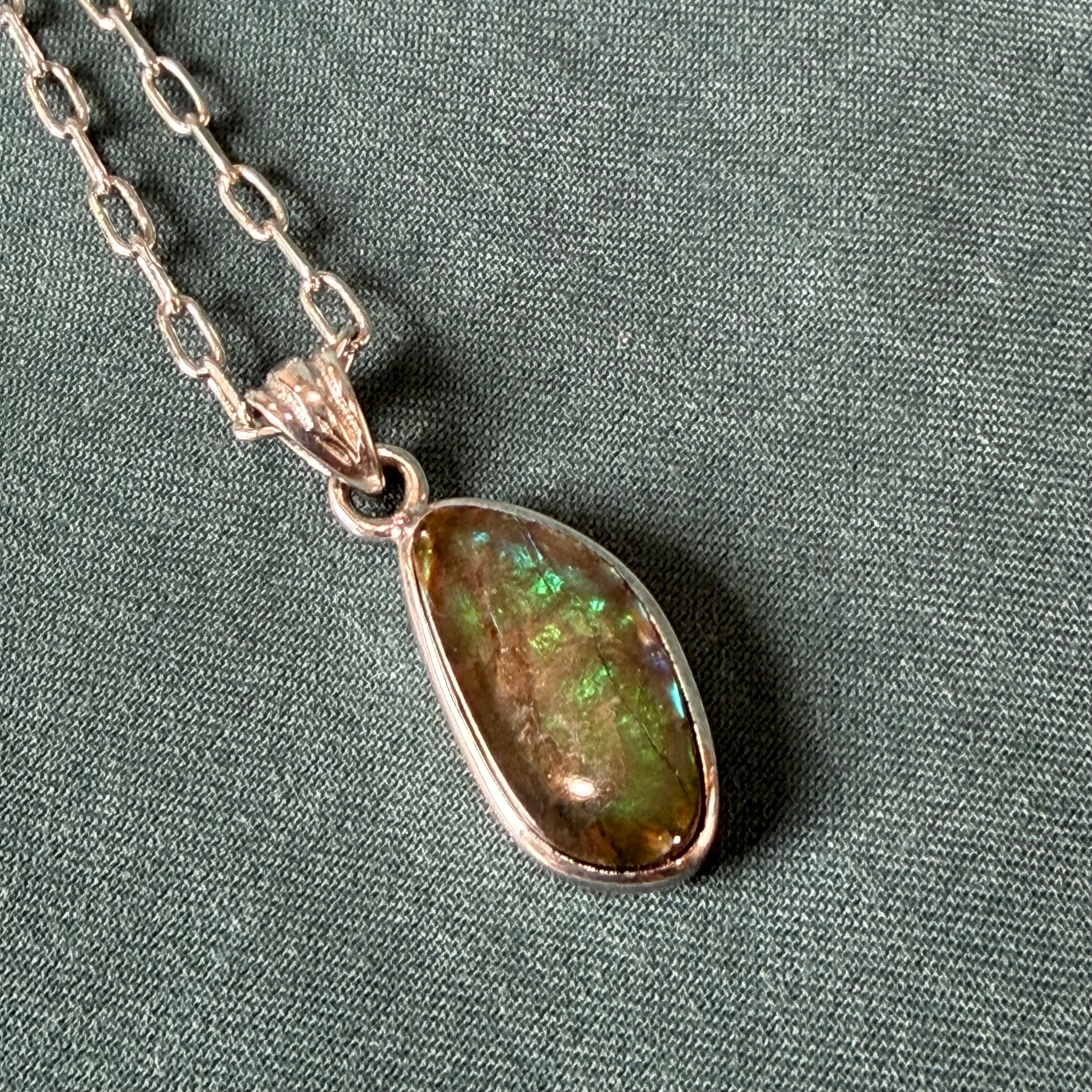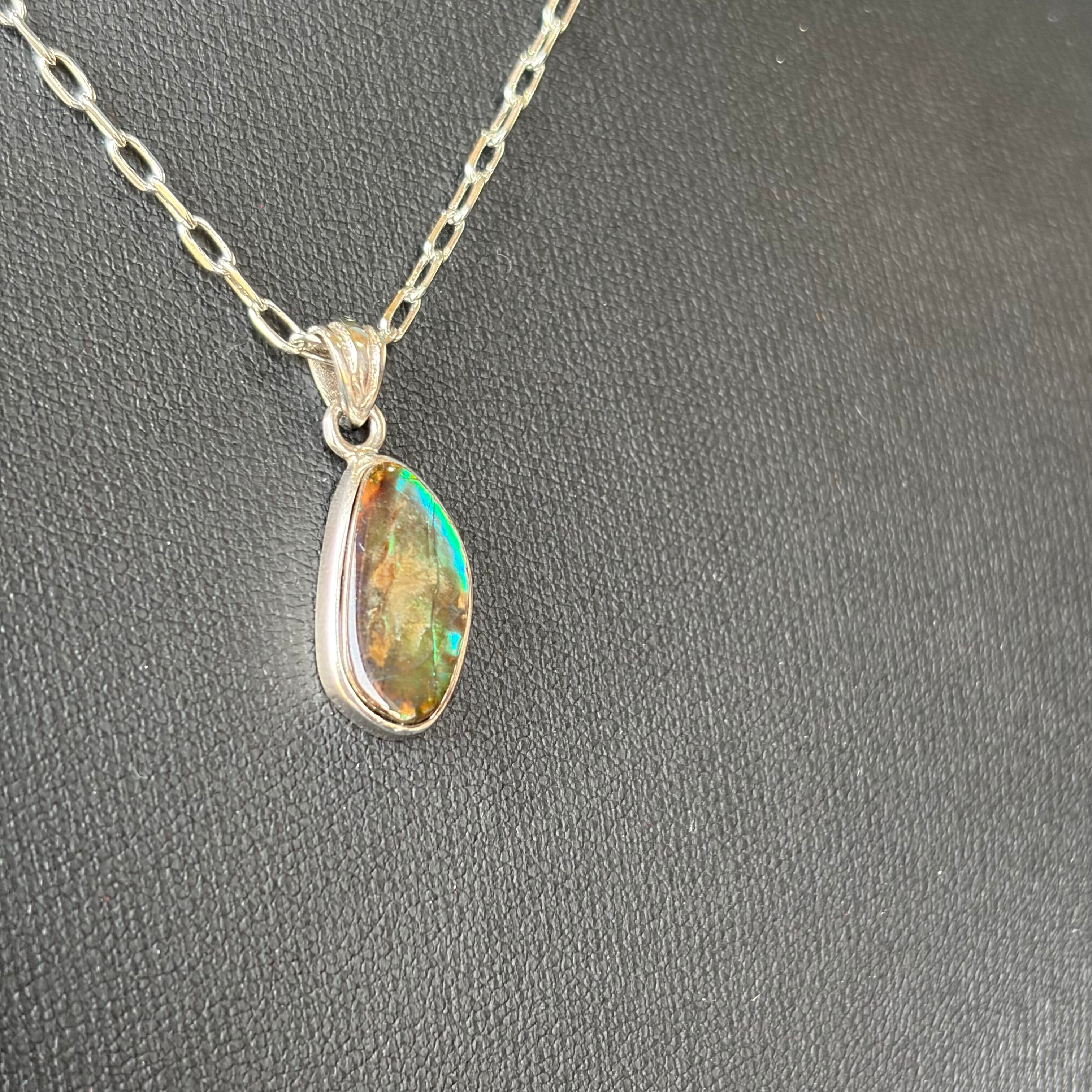 SOLD OUT アンモライトネックレスは、光が当たると美しいブルーの輝きを放つ、特別なデザインのネックレスです。アンモライトの豊かな色彩は、一つ一つ異なる個性を持っており、おしゃれなアクセントとして活躍します。身に着けることで、周囲からの注目を集めることでしょう!
