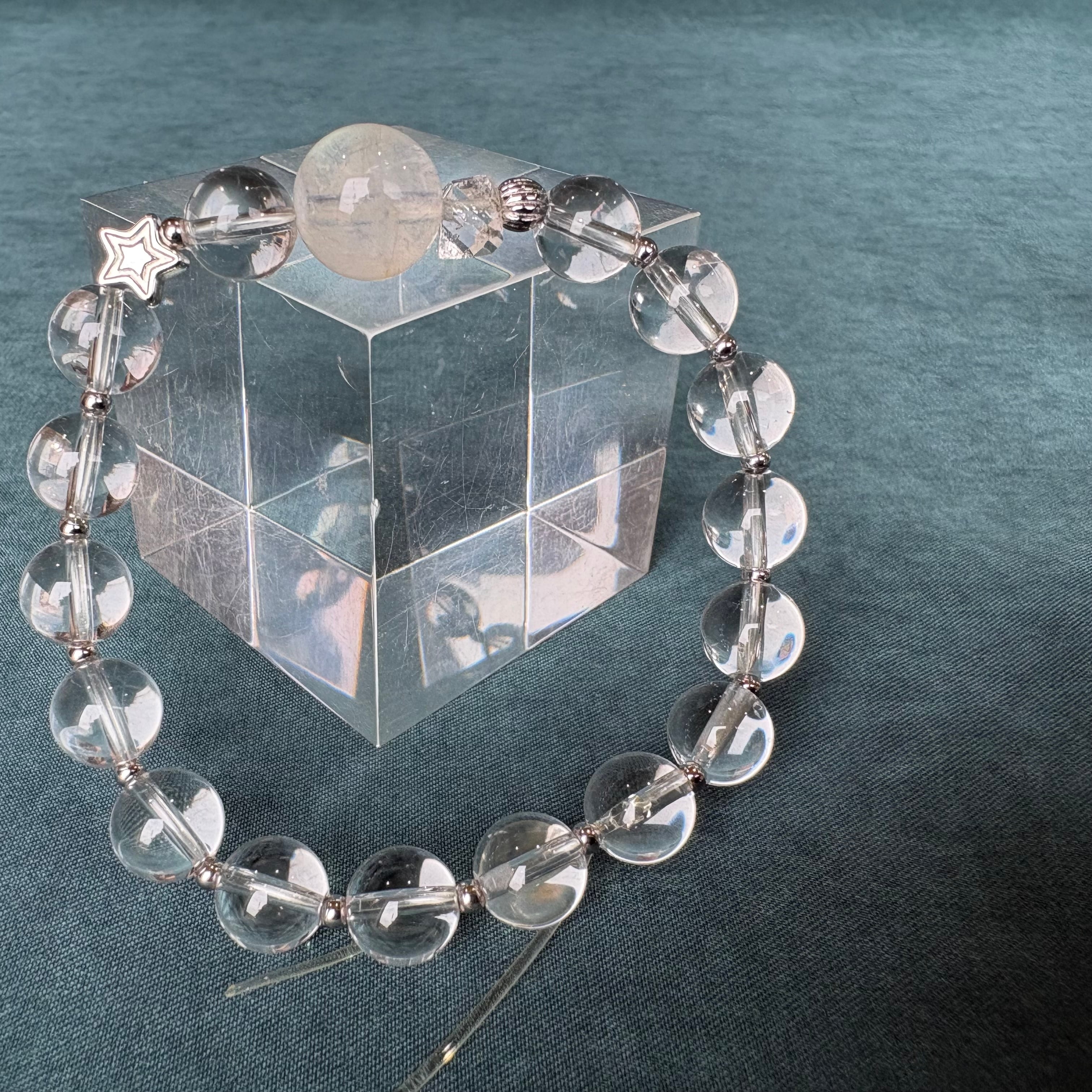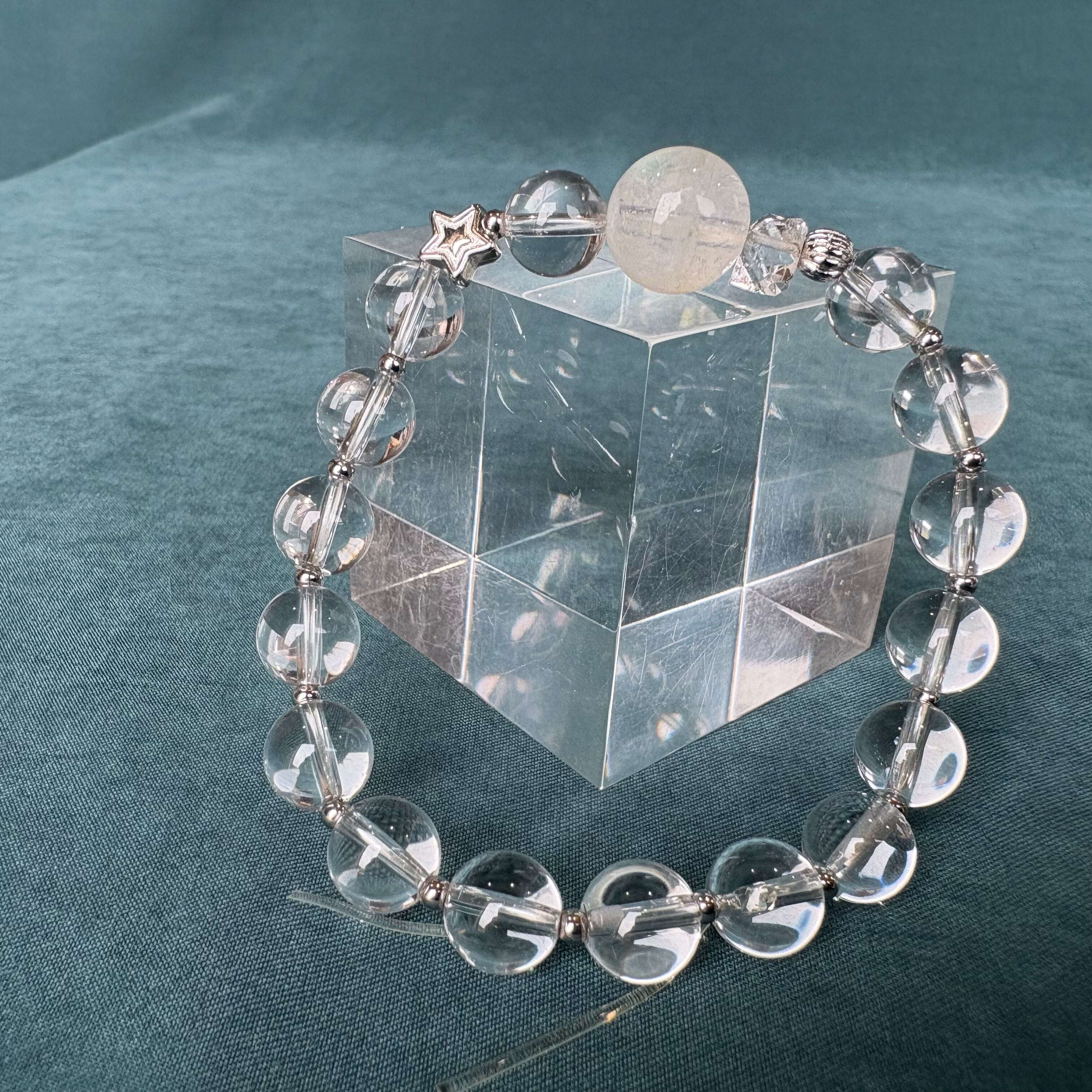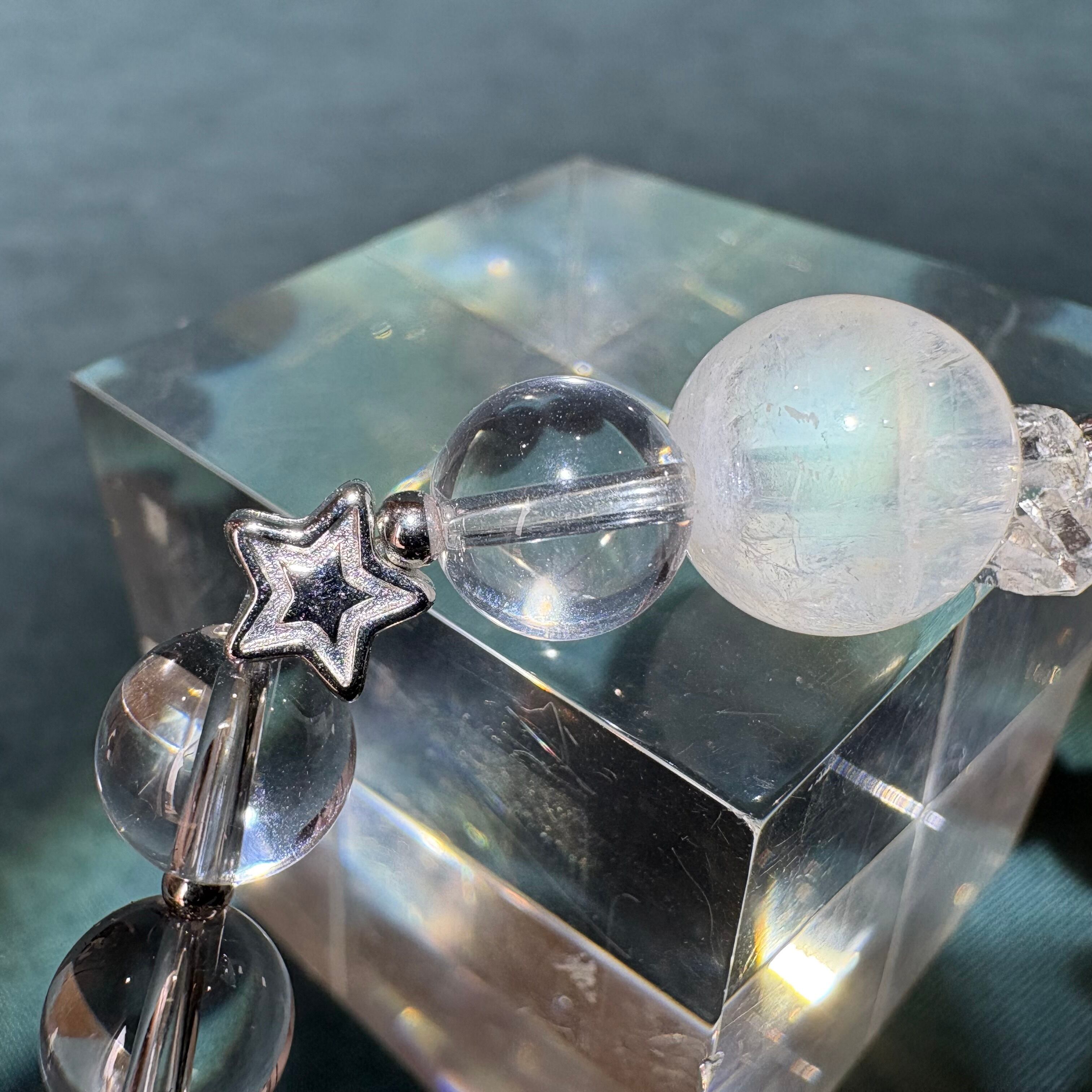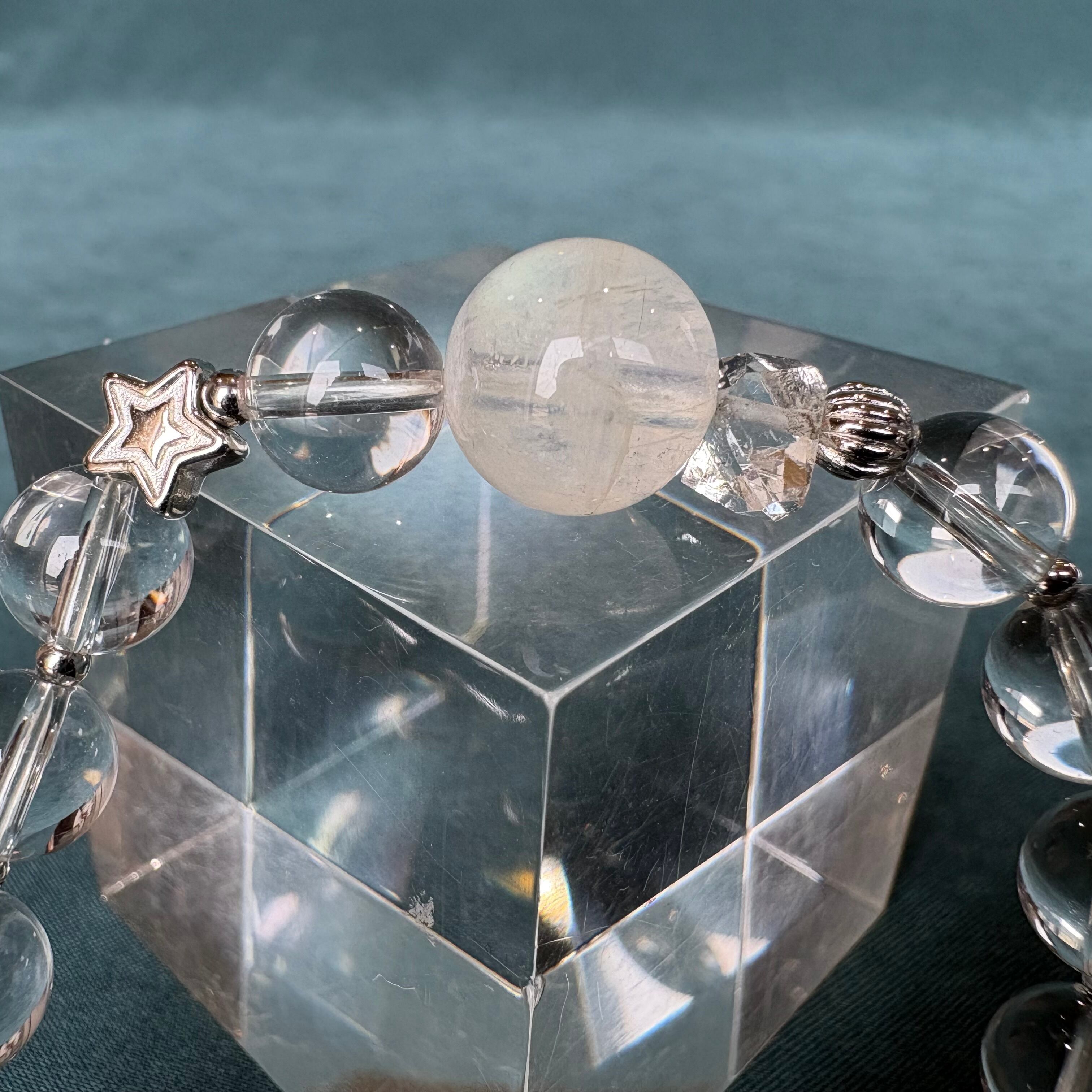 SOLD OUT ムーンストーン・Wポイント水晶ブレスは、シラー入りのムーンストーンを使用した美しいデザインが特徴です。Wポイント水晶と星のチャームが調和し、身に着けることで心に安らぎをもたらします。多彩な色合いや輝きが魅力的で、どんなスタイルにもマッチします。