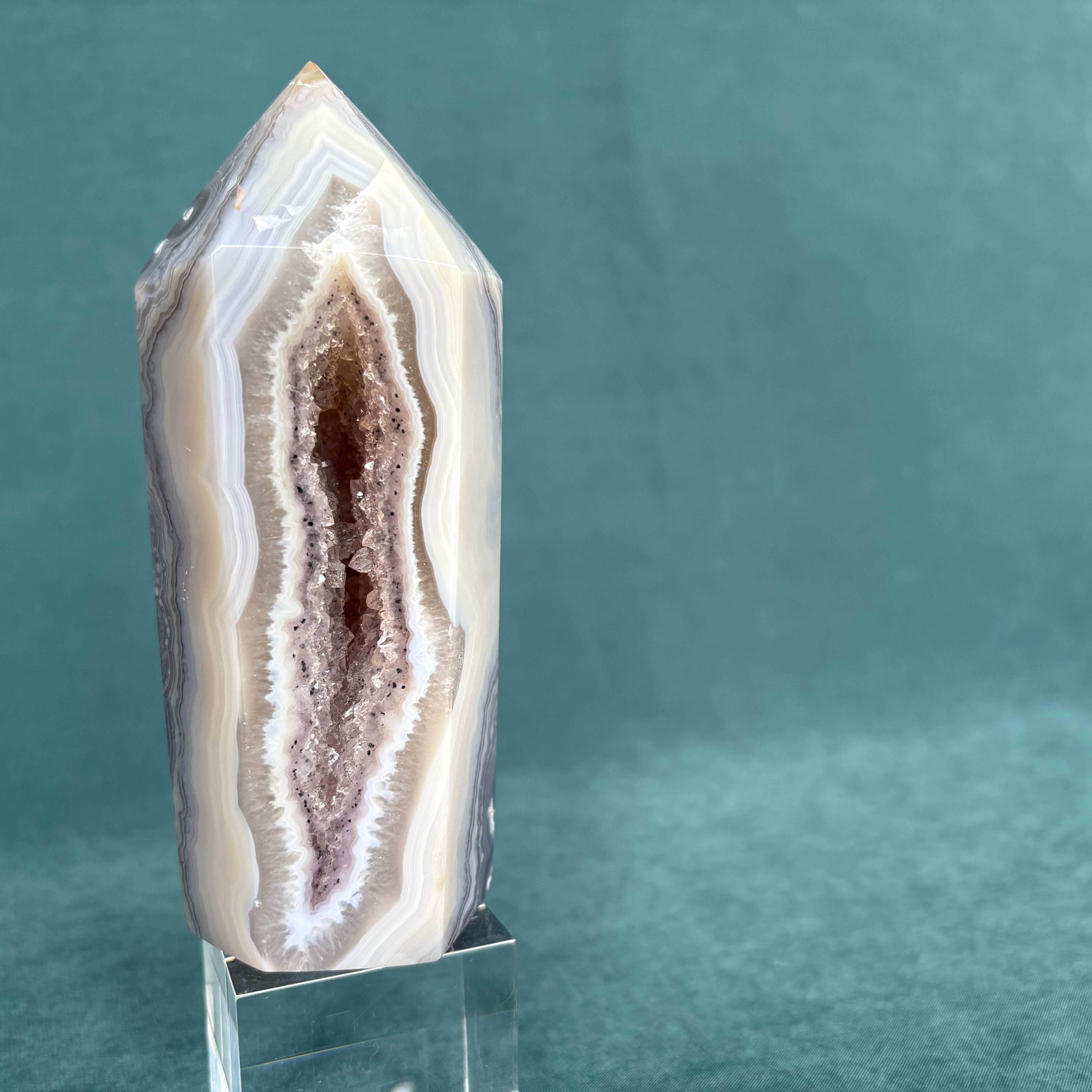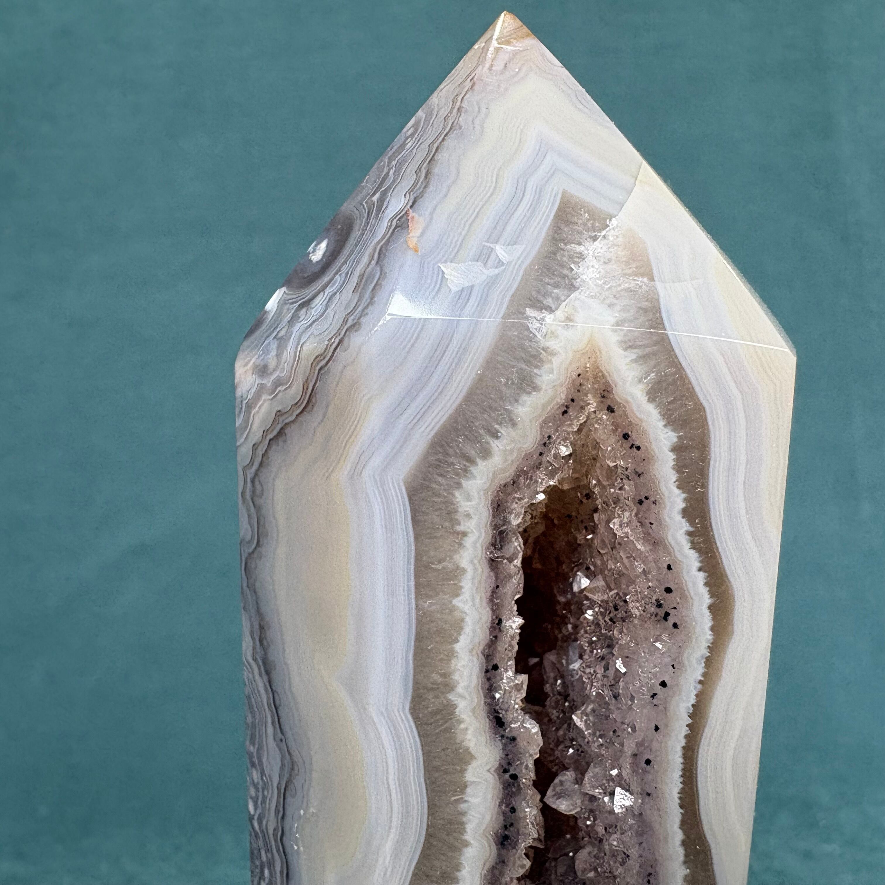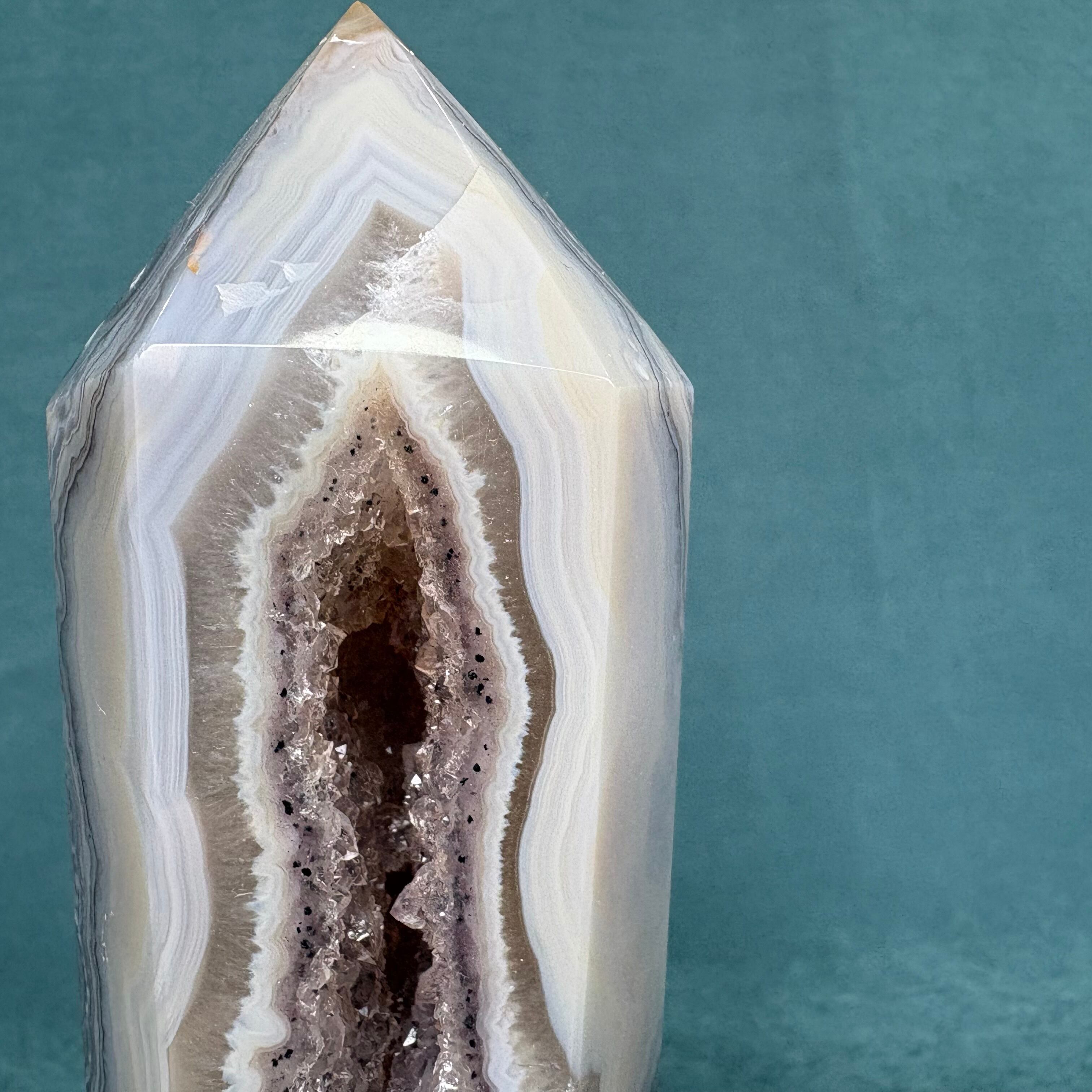 ジオードアゲートは、美しい色合いと透明感が魅力の天然石です。ジオードタイプのアゲートは、個性豊かな模様が施されており、どの角度から見ても楽しめます。この繊細な石は、インテリアに自然なアクセントを加えることができ、心地よい空間を演出します。お部屋やオフィスのスタイルにマッチすること間違いなしです!