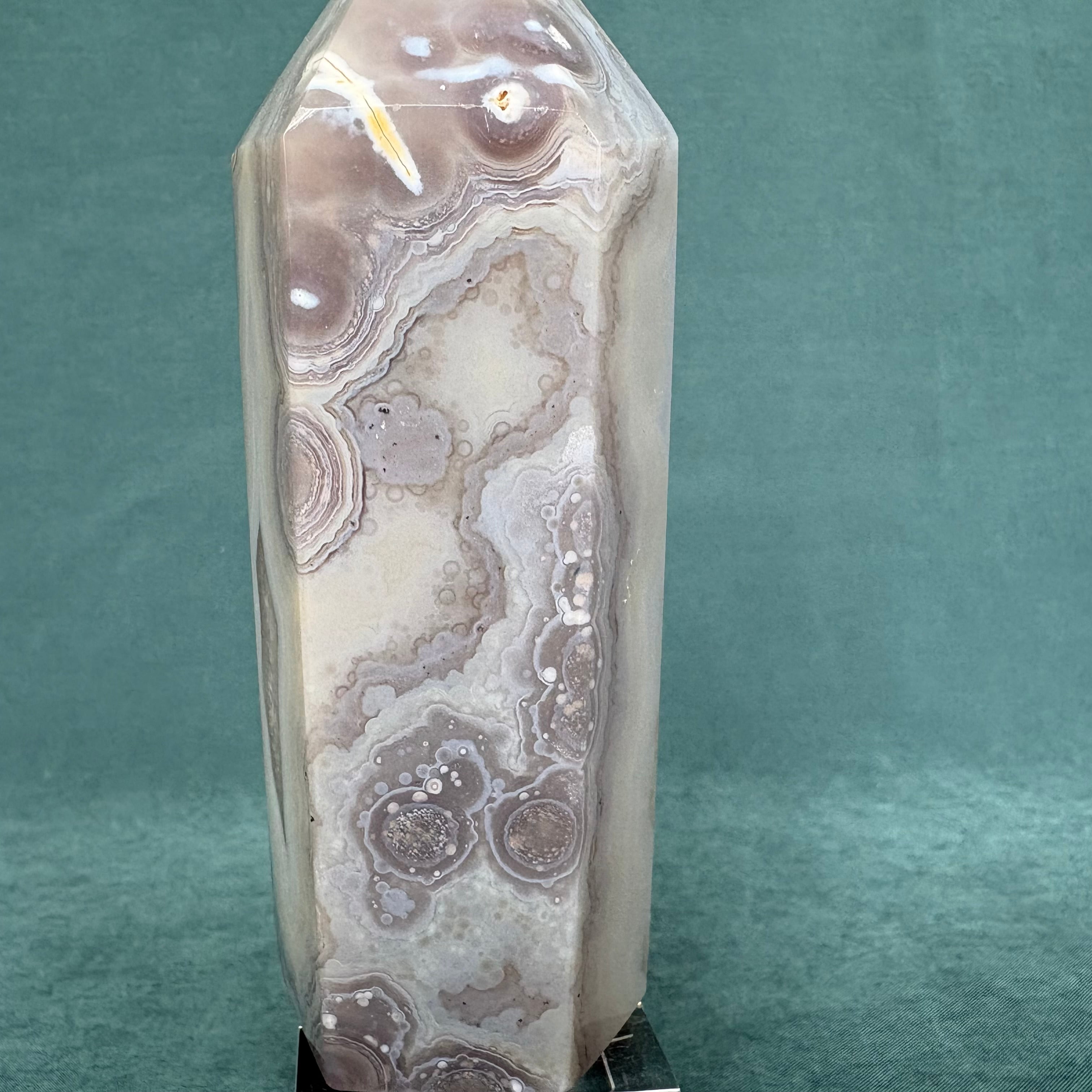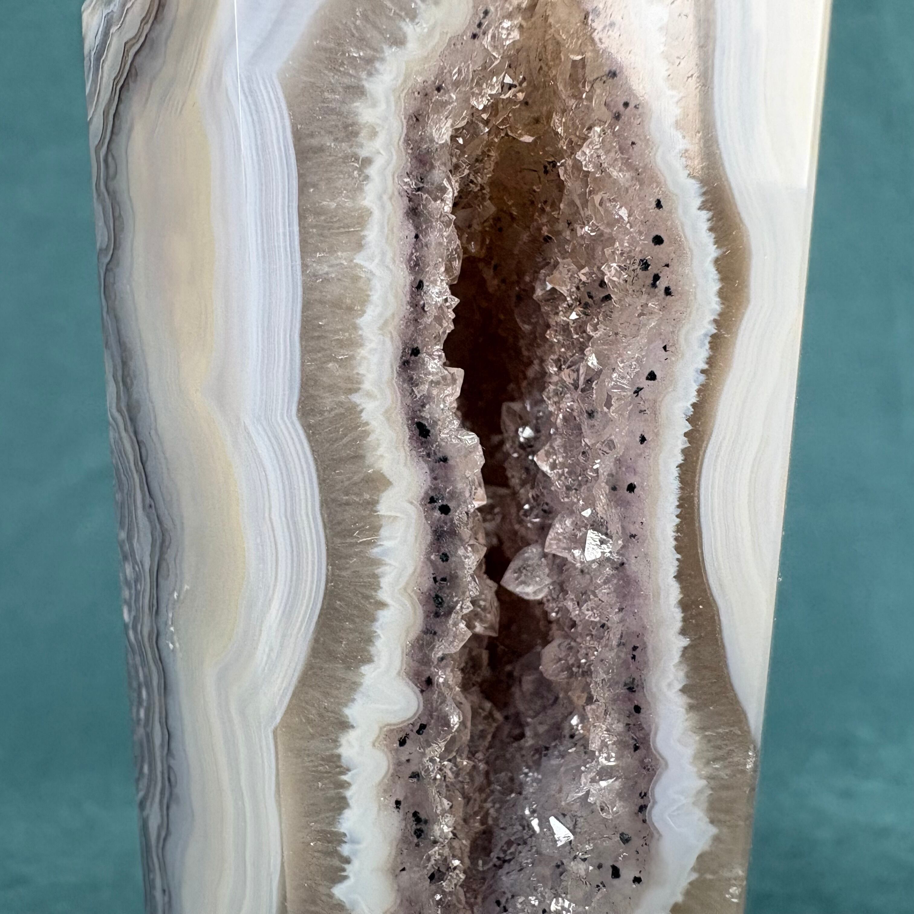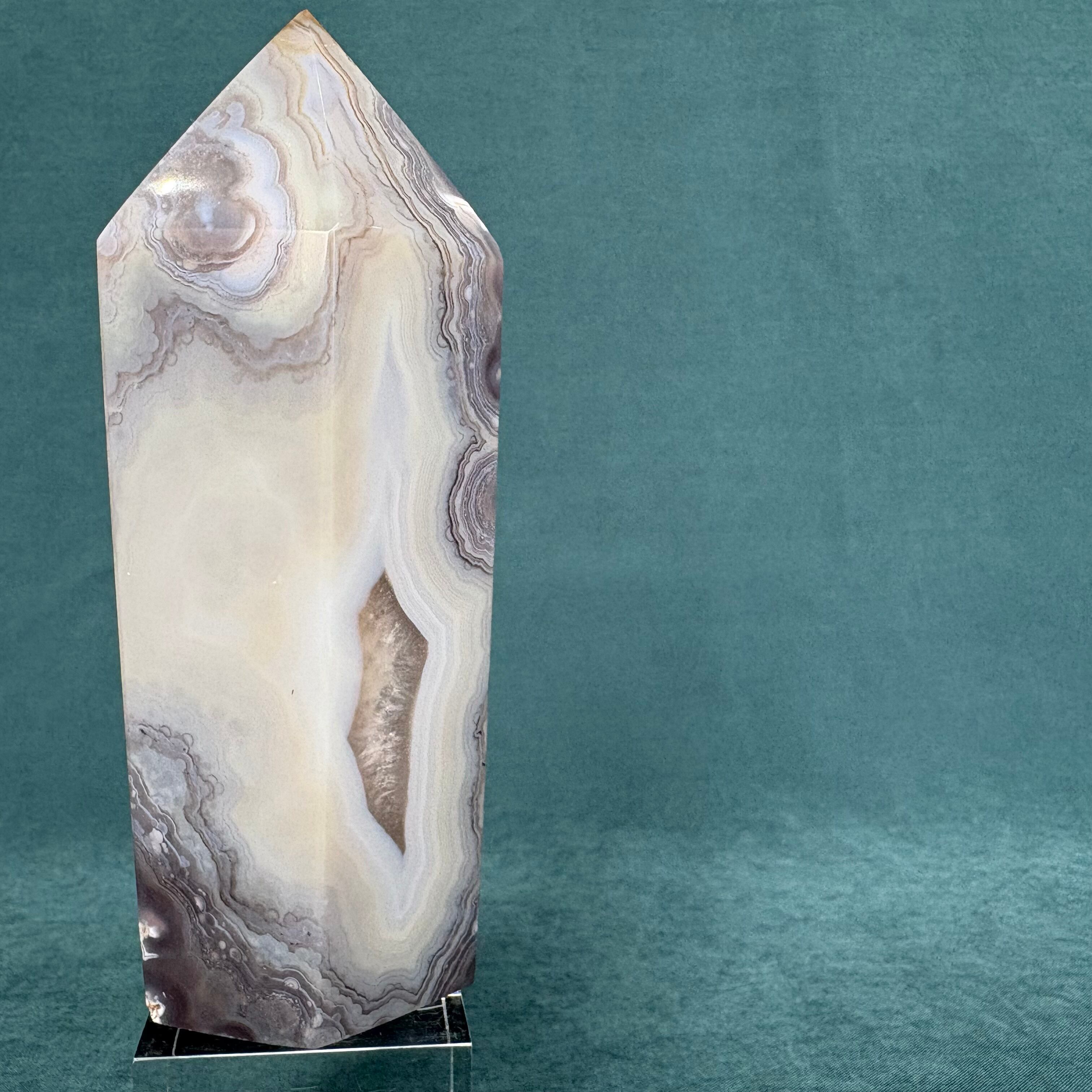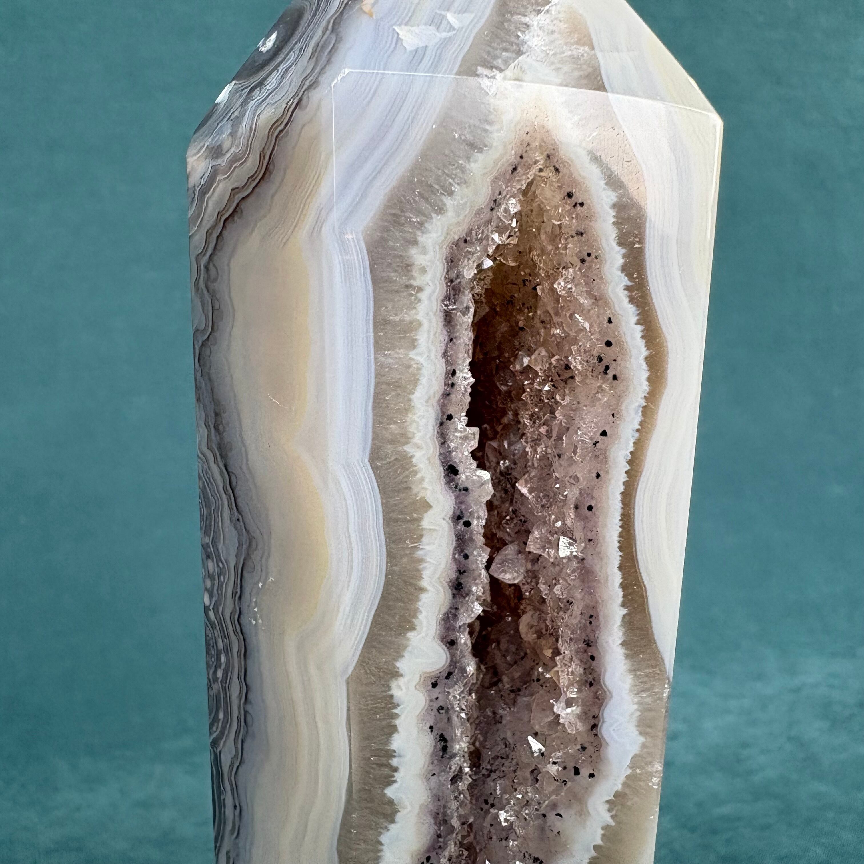 ジオードアゲートは、美しい色合いと透明感が魅力の天然石です。ジオードタイプのアゲートは、個性豊かな模様が施されており、どの角度から見ても楽しめます。この繊細な石は、インテリアに自然なアクセントを加えることができ、心地よい空間を演出します。お部屋やオフィスのスタイルにマッチすること間違いなしです!