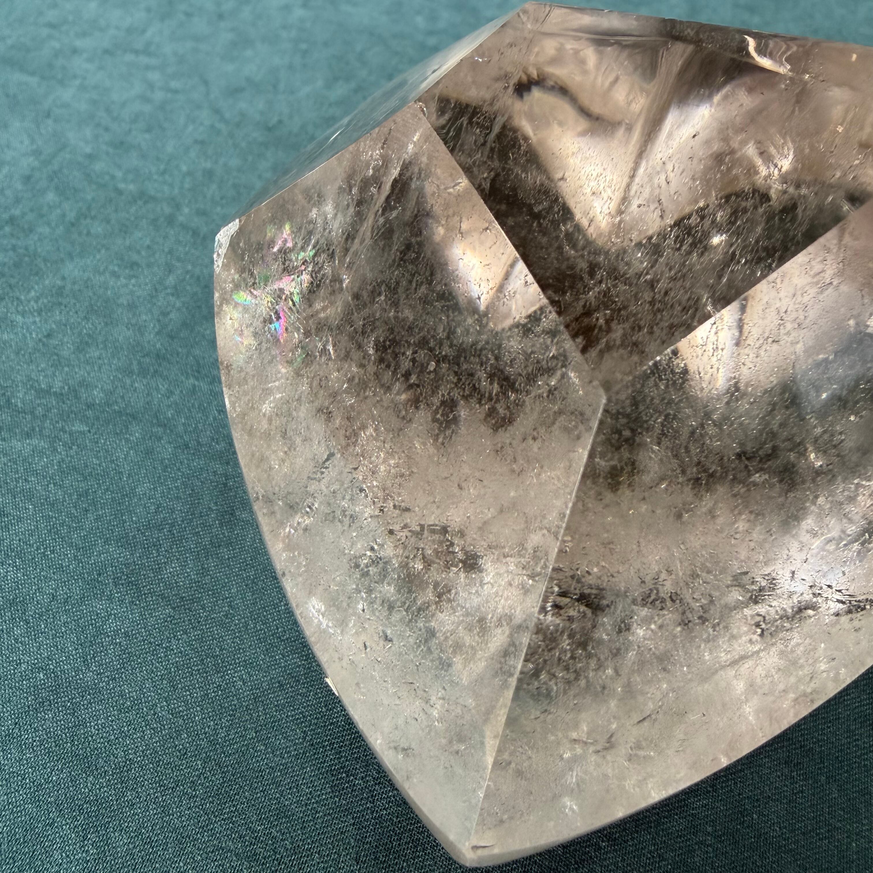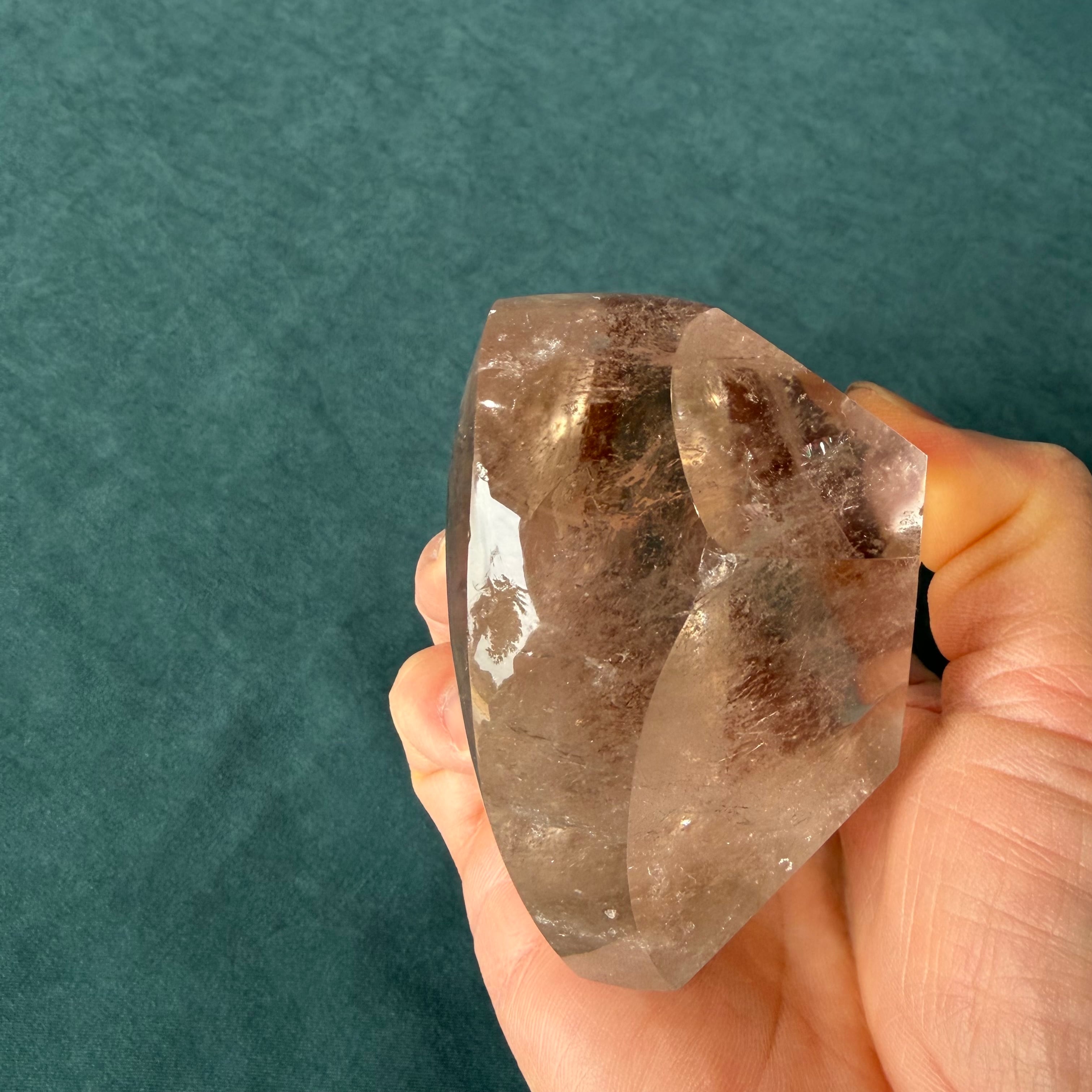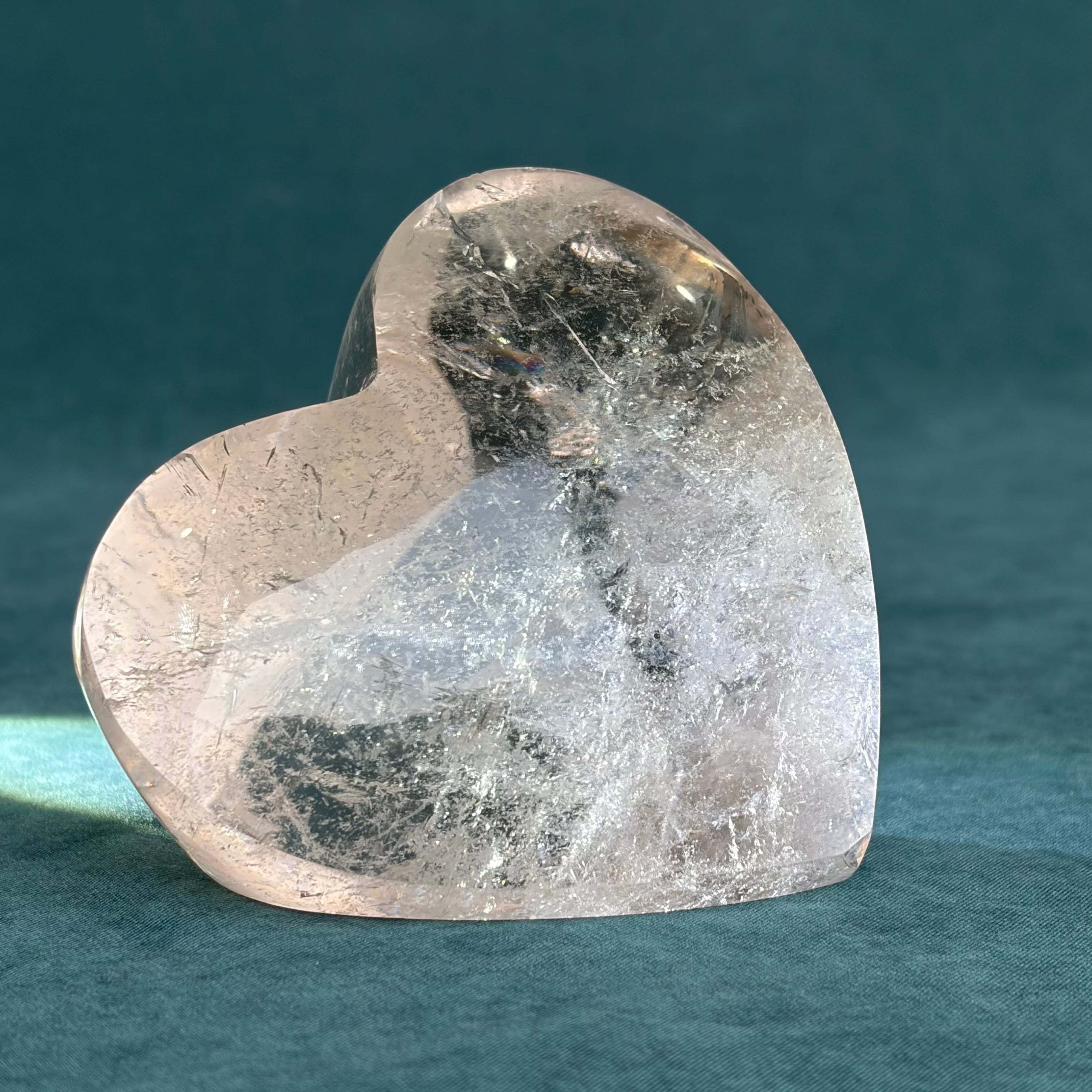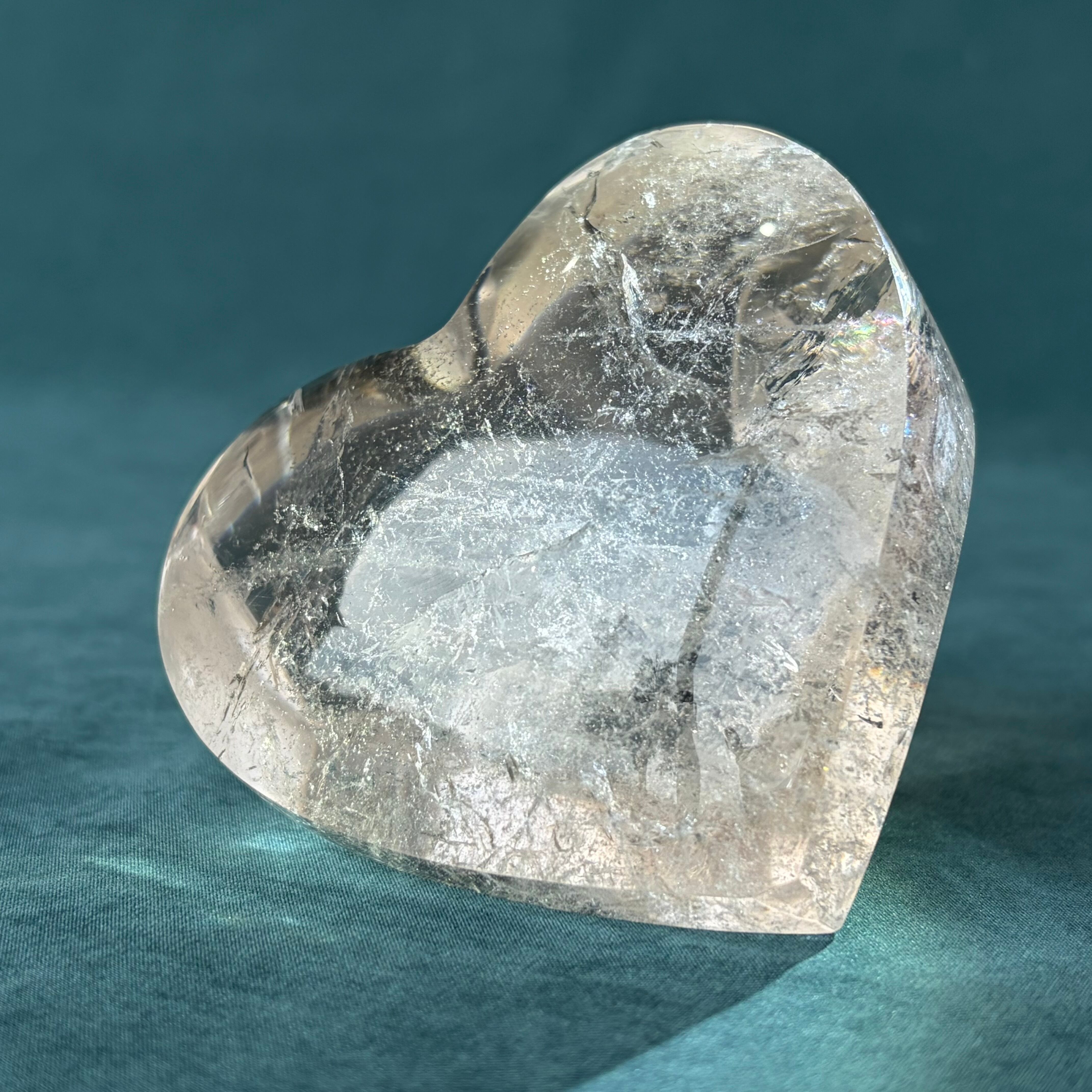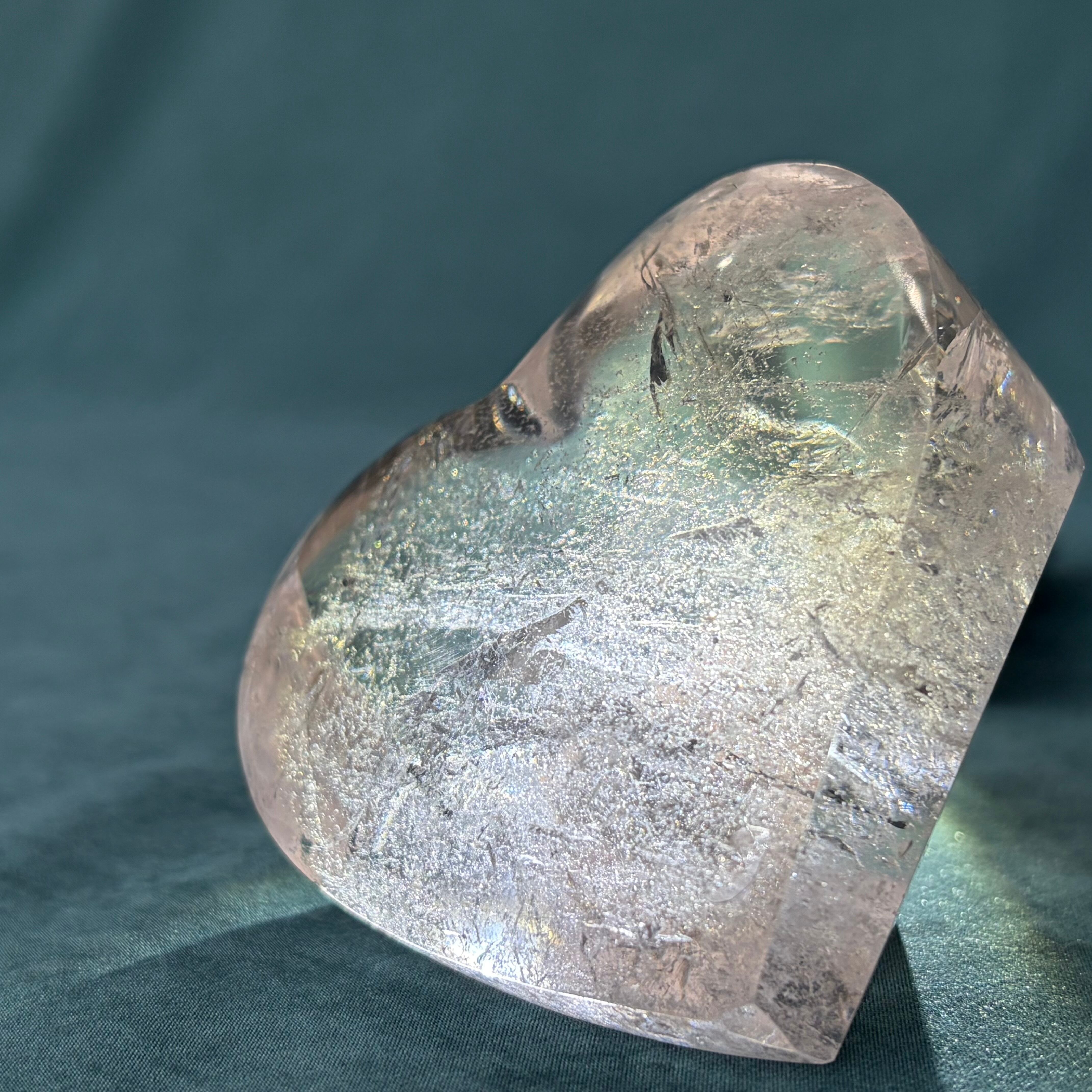 レムリアンクォーツの魅力を余すところなく味わえる、ハートカットの自立型デザインが特徴です!しっかりとした厚みを持ち、透明度は抜群。若干スモーキーな風合いが、その神秘的な雰囲気を一層引き立てています。