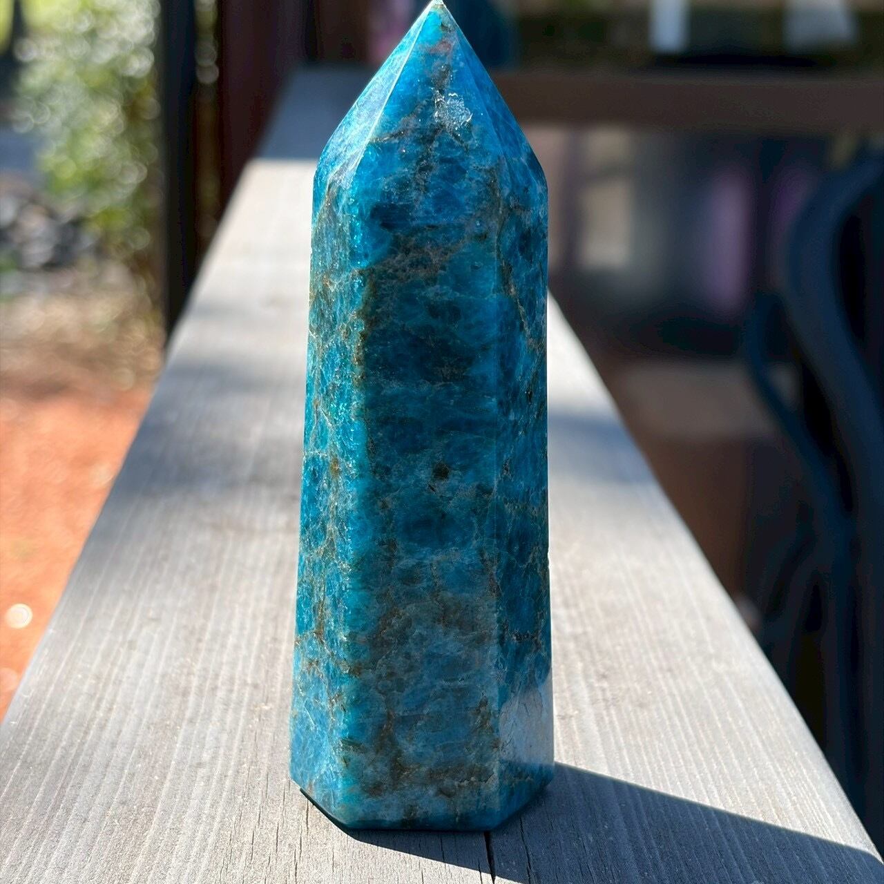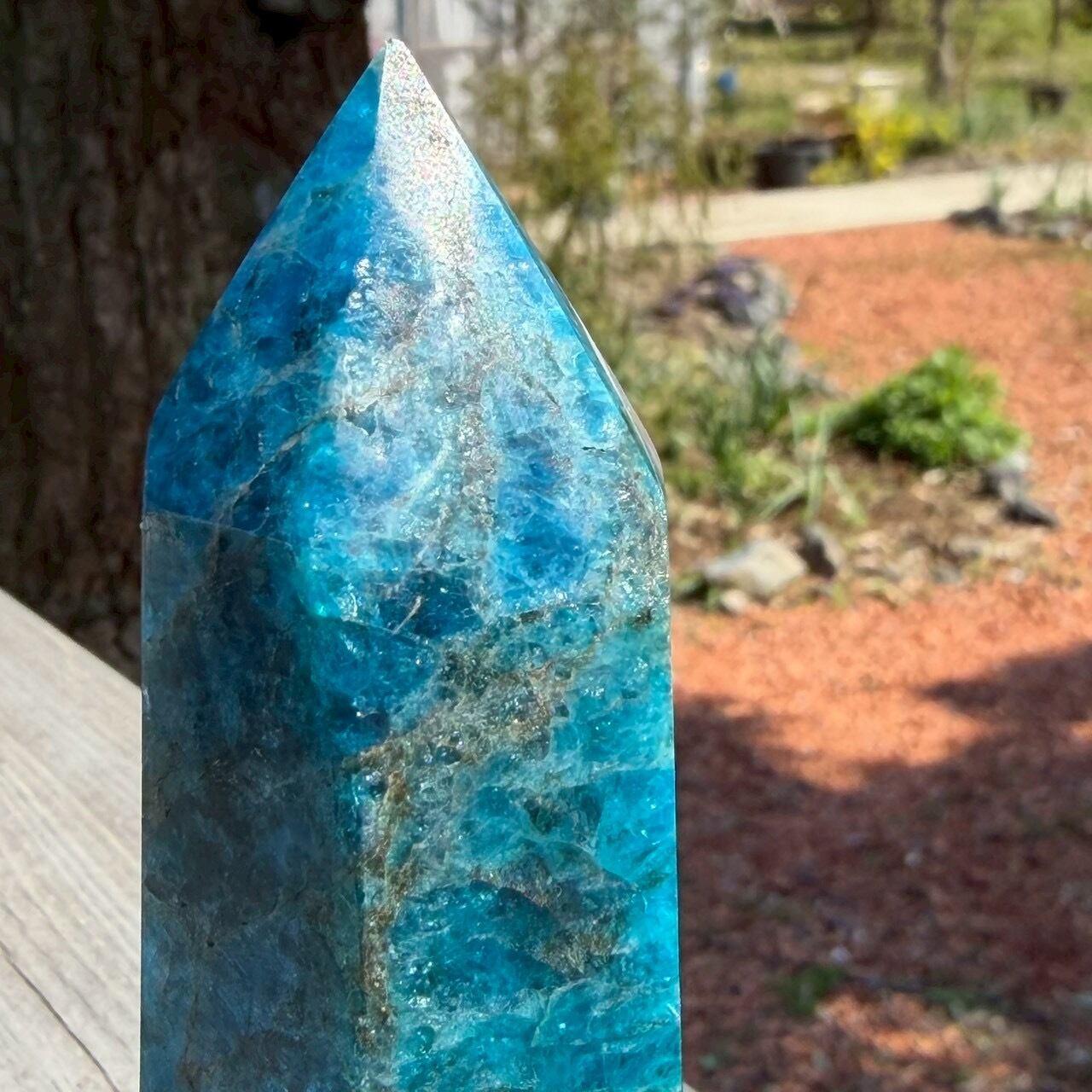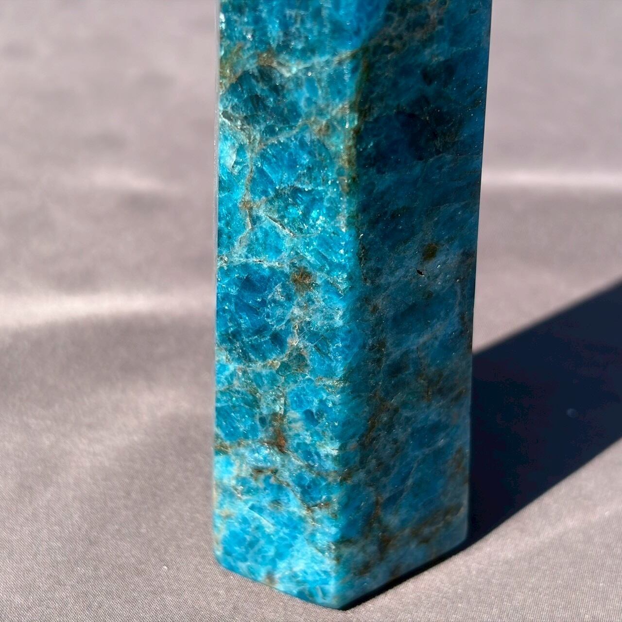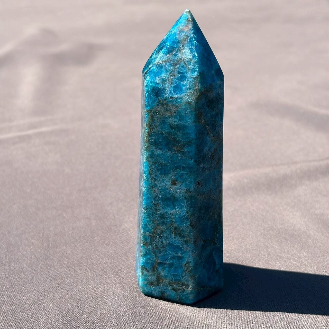 濃厚なブルーが美しいブルーアパタイトポイント。魅惑的なカラーは、見る人の心を引きつけ、空間に特別なエネルギーを与えます。天然の美しさをそのまま生かした商品で、インテリアやアクセントとして最適です。