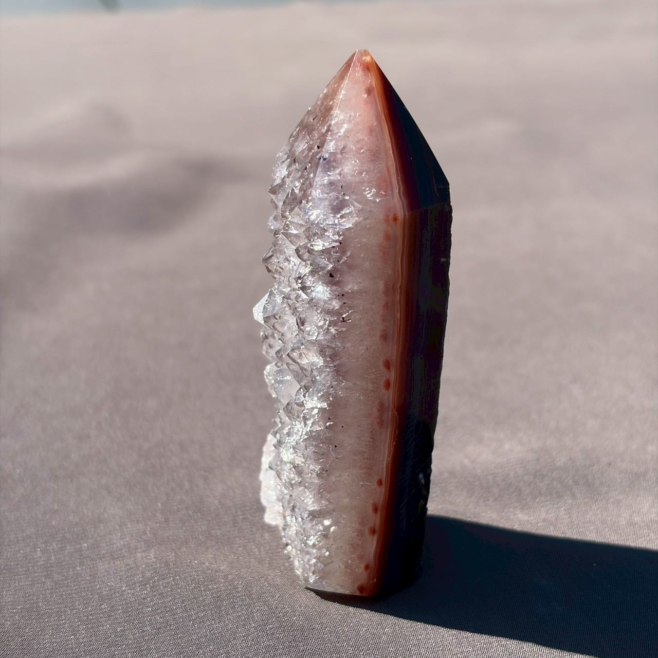 透明感のあるジオードが、美しい光を放ち、見る者を魅了します。天然の持つ独特なデザインや色合いは、一つとして同じものがなく、どれもが特別な存在です。インテリアとしてもさまざまなシーンで活躍します。