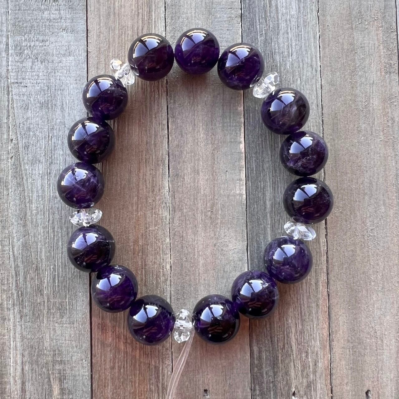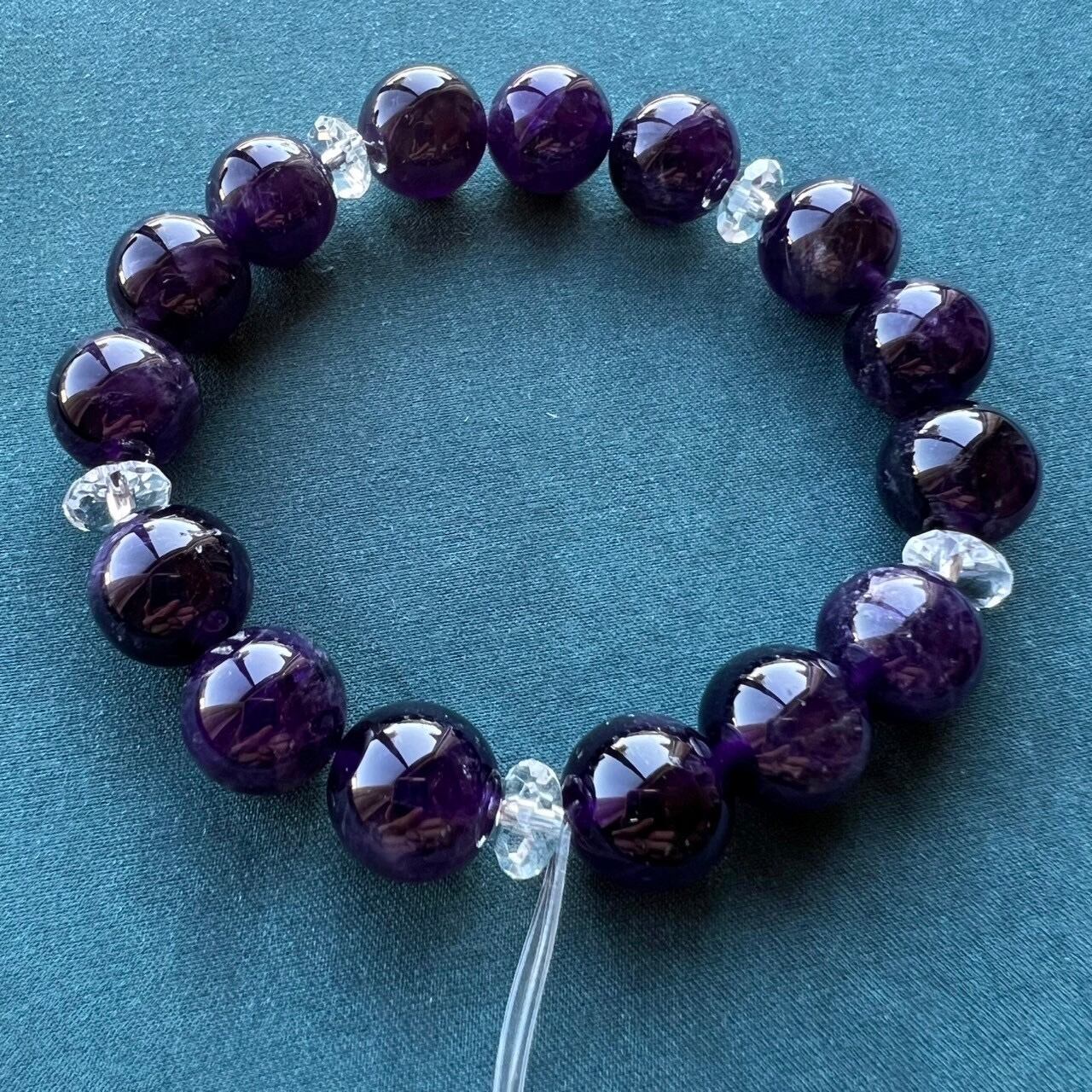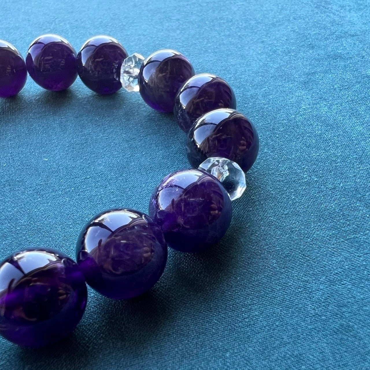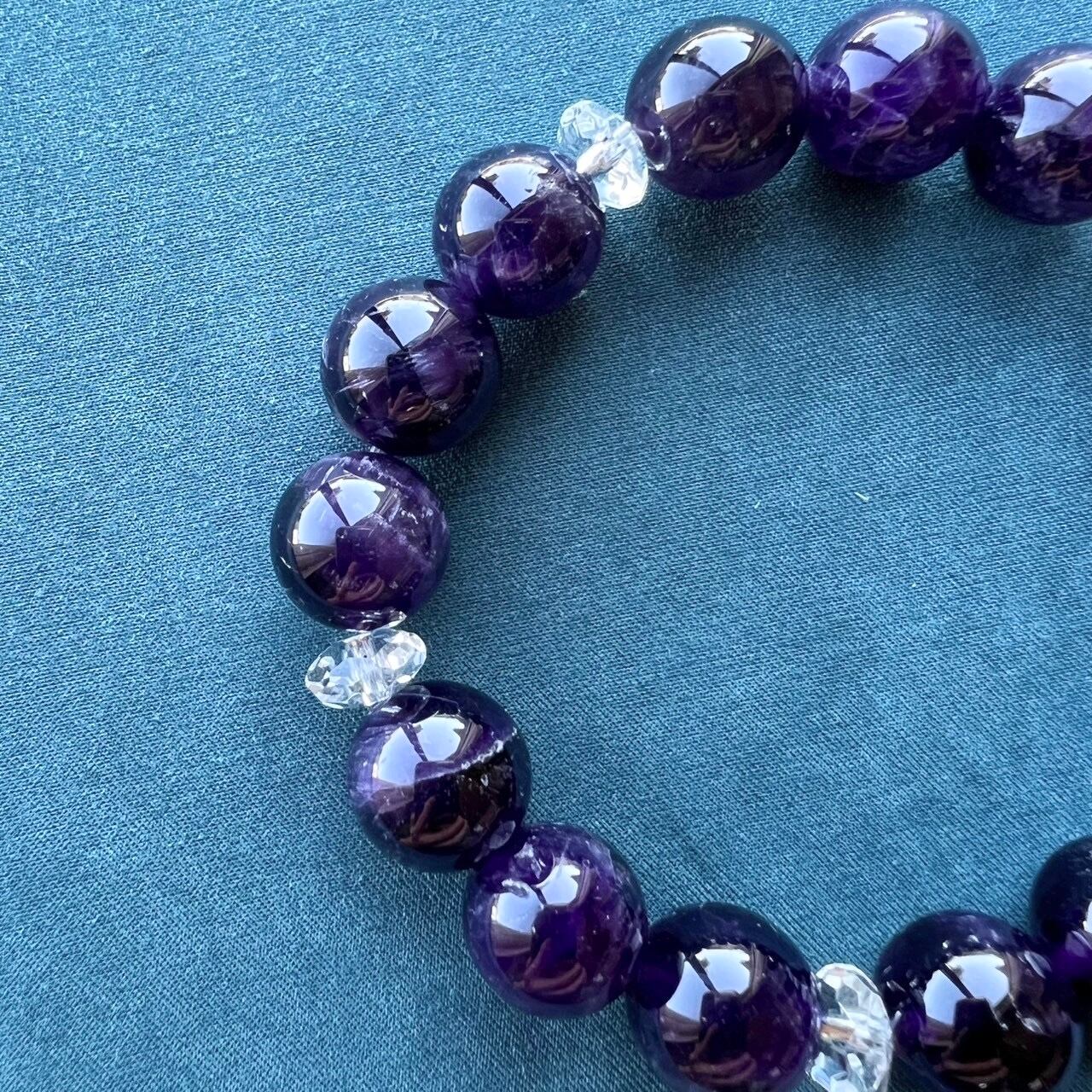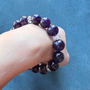 ブレスレットNo.28(アメシスト・水晶)は、アメシストと水晶の美しい組み合わせによって、洗練された印象を与えます。アメシストは心を落ち着ける効果があると言われており、水晶はその浄化作用で知られています。両石の持つエネルギーが調和し、リラックス効果をもたらすことでしょう。